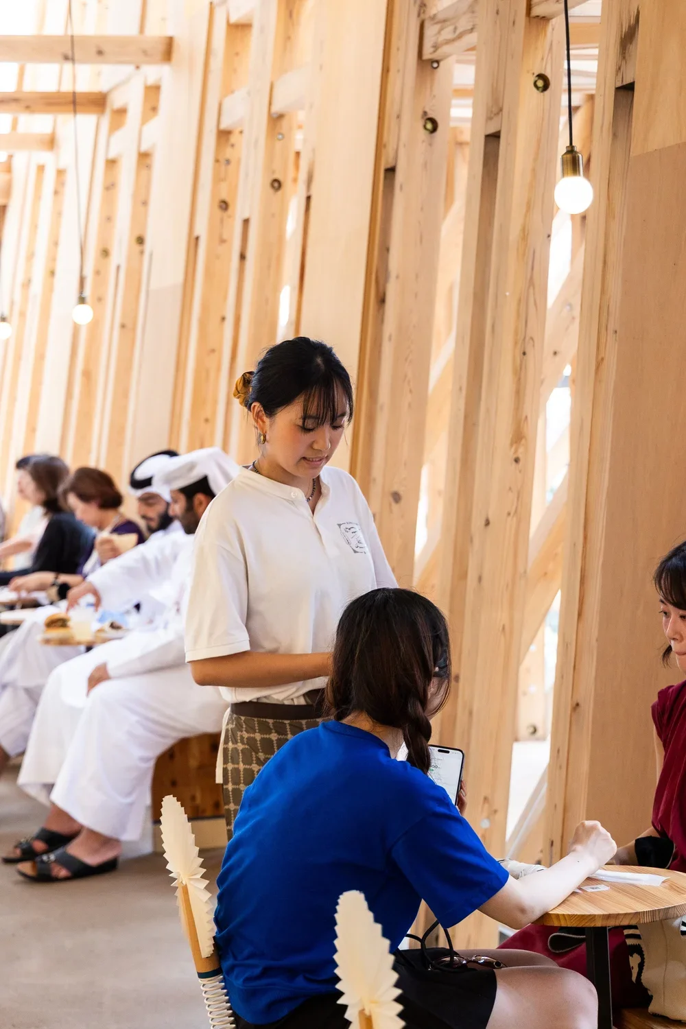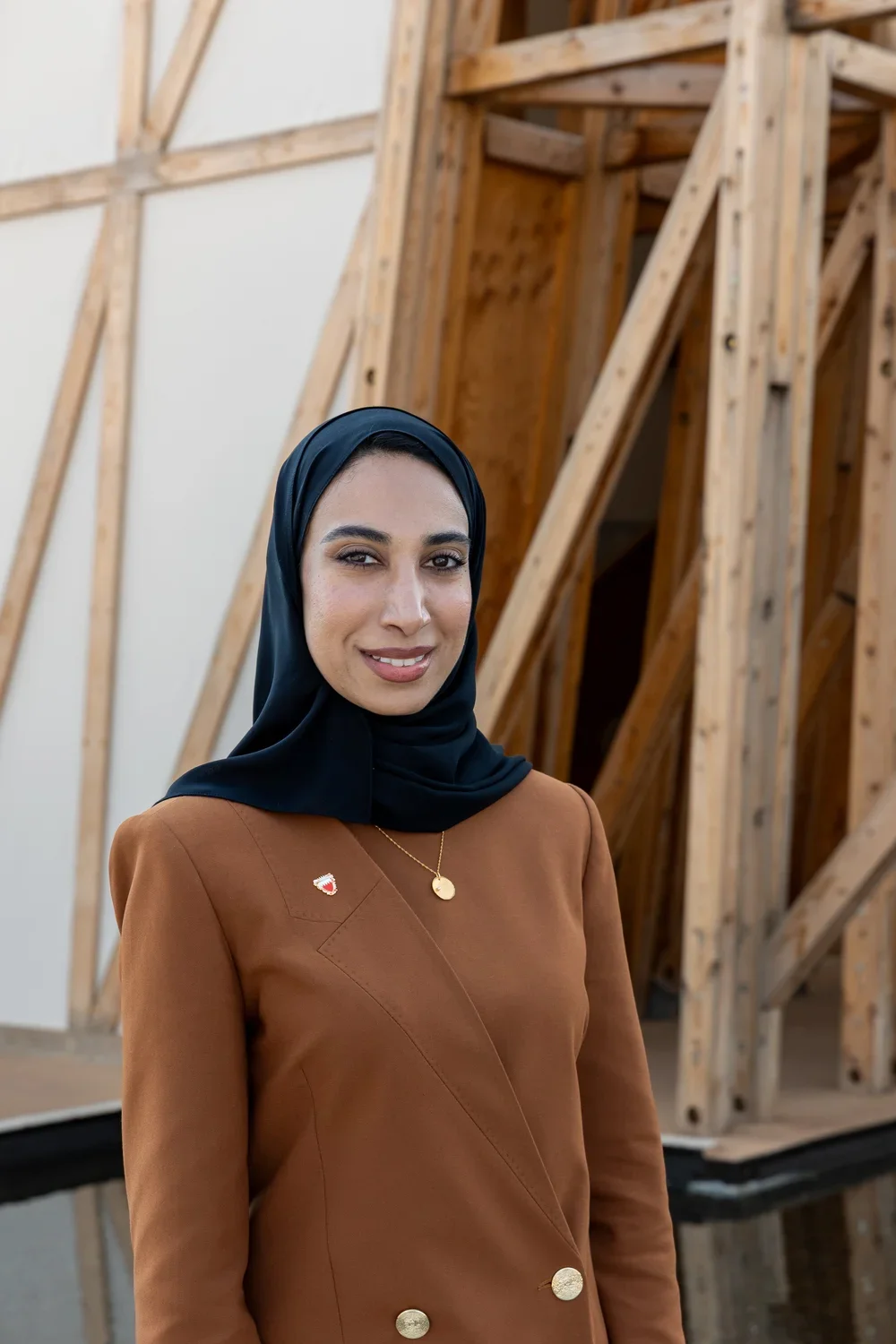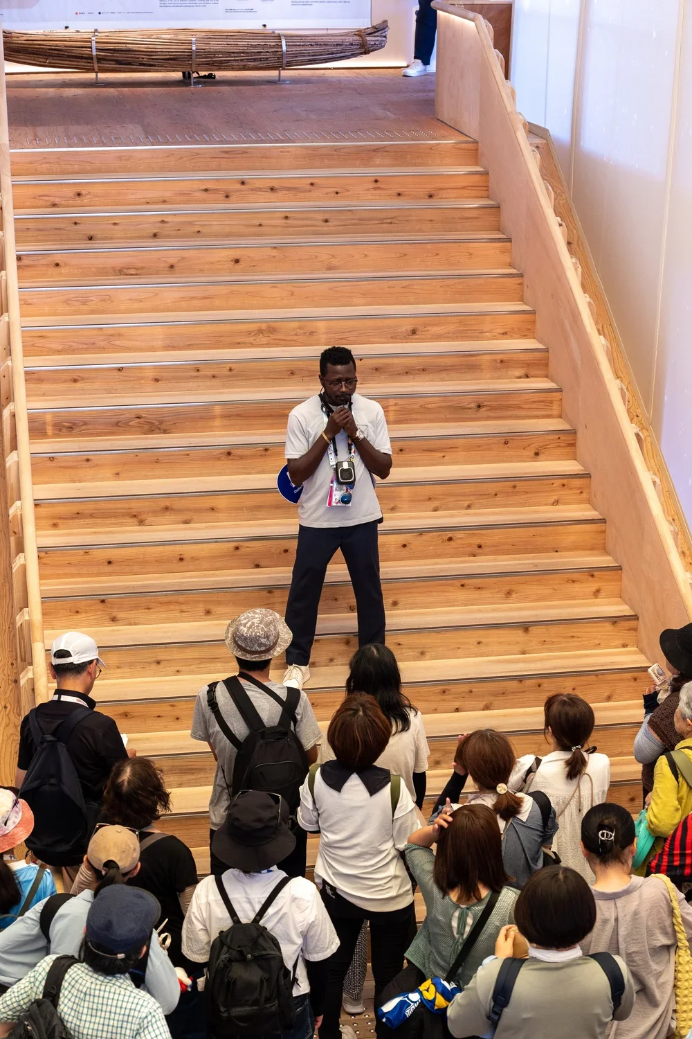 Architecturally, the pavilion stands as a four-story structure—ranging from 13 to 17 meters in height—spanning approximately 995 square meters. It evokes the form and essence of a traditional Bahraini dhow, rendered in a graceful, curved wooden frame composed of around 3,000 pieces of un-engineered wood, assembled with intricate joinery blending Bahraini craftsmanship and Japanese woodworking traditions.